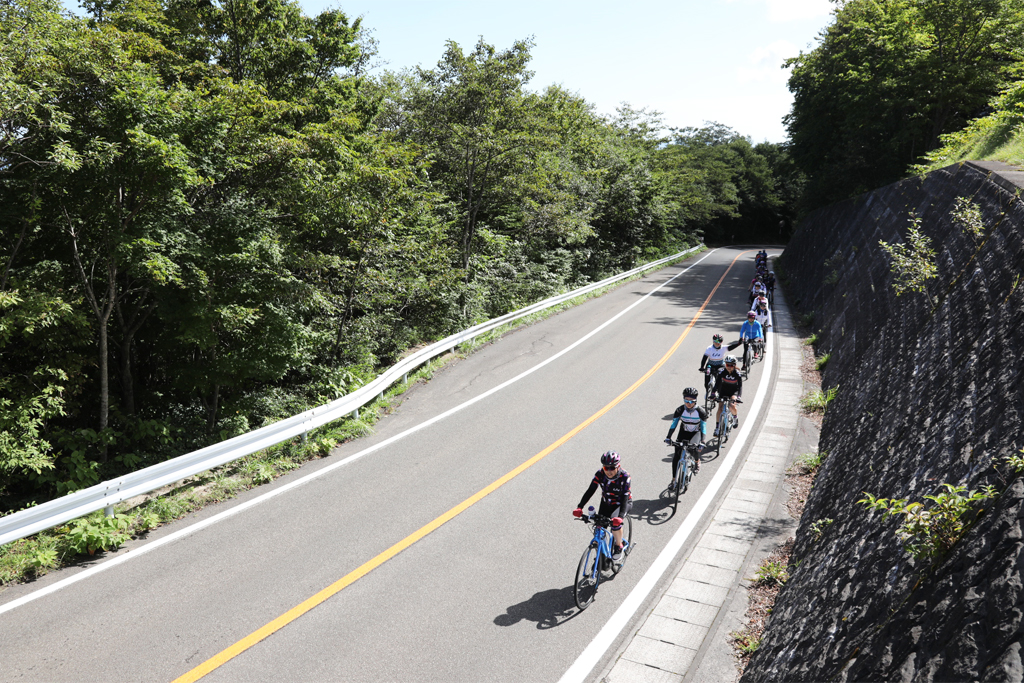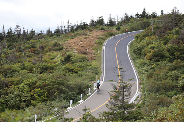 一行が走るコースは、ヒルクライムレースの舞台としても知られる蔵王エコーライン。レースコースのプロファイルは、大会当日のみ通行解除される自動車専用道路「ハイライン」(2.75km)を含めると全長18.7km、獲得標高1334m。平均勾配7%、最大勾配12%という、国内のヒルクライムレースの中でも屈指の難コースといわれる。