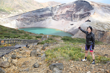 「お釜」に到着! ついにリベンジ達成(e-BIKEだけど) © GIANTようやく見えてきた「お釜」に全員の歓声が上がった。エメラルドグリーンの水をたたえた火口湖に雲間から光が差す。麓からペダルを回し、自力でたどり着いた景色を前に、蔵王をまるごと味わい尽くした気持ちで満たされた。