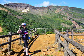 そこから先、山頂まではリフトを使い、上りきったところからさらに「お釜」を目指して少し歩く。ゴロゴロした岩がある砂利道だが、フラットペダルなのでビンディングシューズで歩くストレスもない。