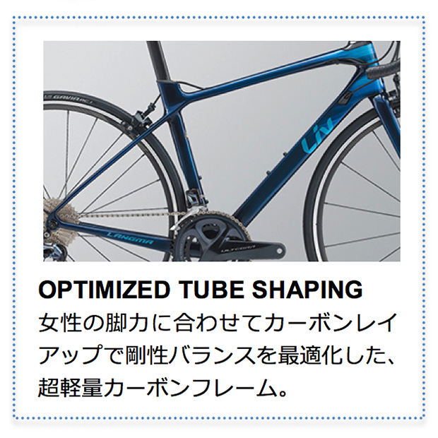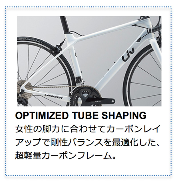 女性に最適な剛性となるようデザインされた、軽量カーボンロード「ランマ」。女性のためにサイズや形状にもこだわったパーツが、身体との一体感を生みだし効率的なサイクリングを可能にする。「1」には乗る度に気持ちを盛り上げてくれる、魅惑的なグラデーションカラーを採用。「2 SE」は、光に反応して虹色に輝くレインボーホワイトカラーのフレームに、パワーメーターを左クランクに備えた特別仕様。