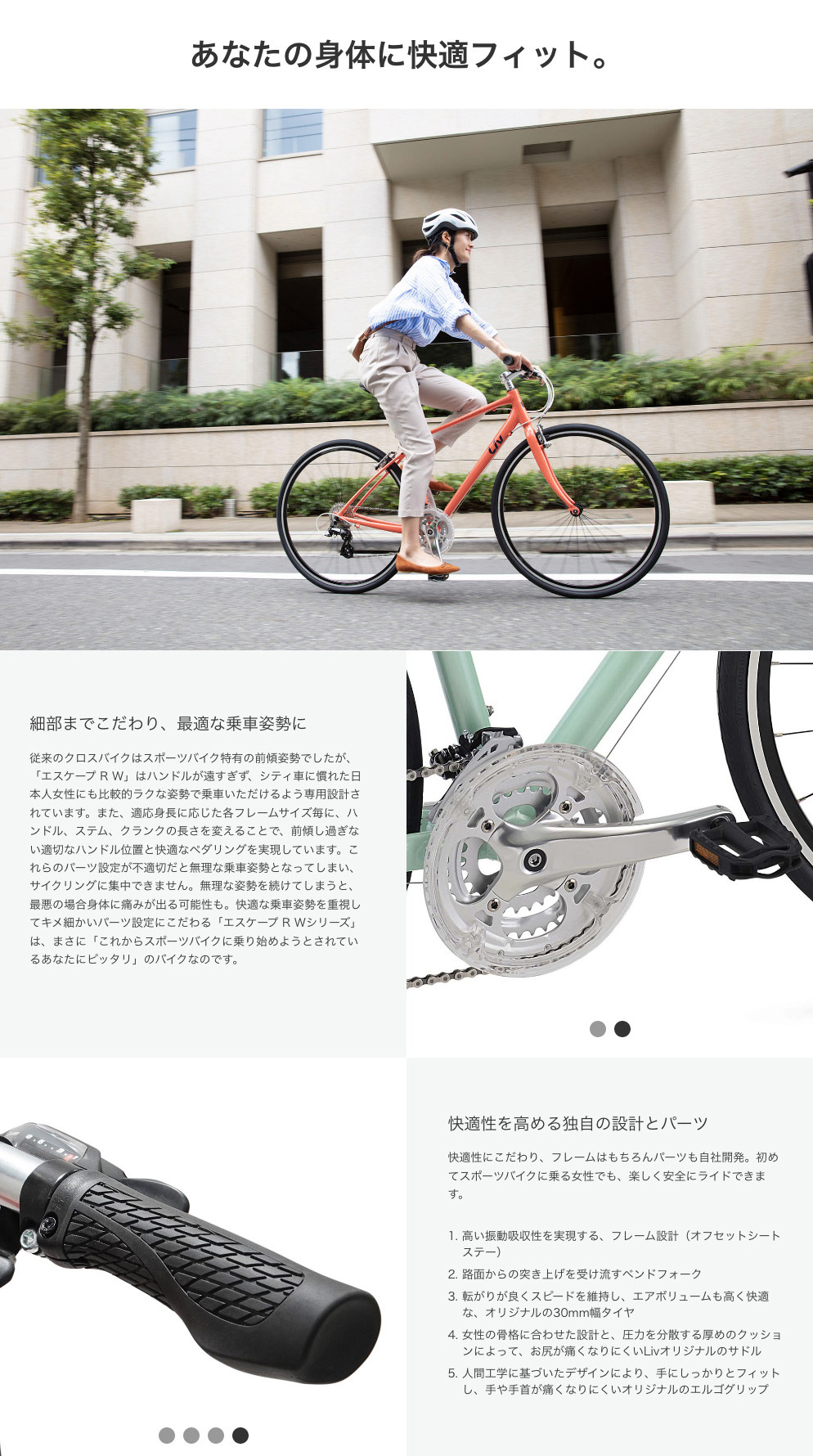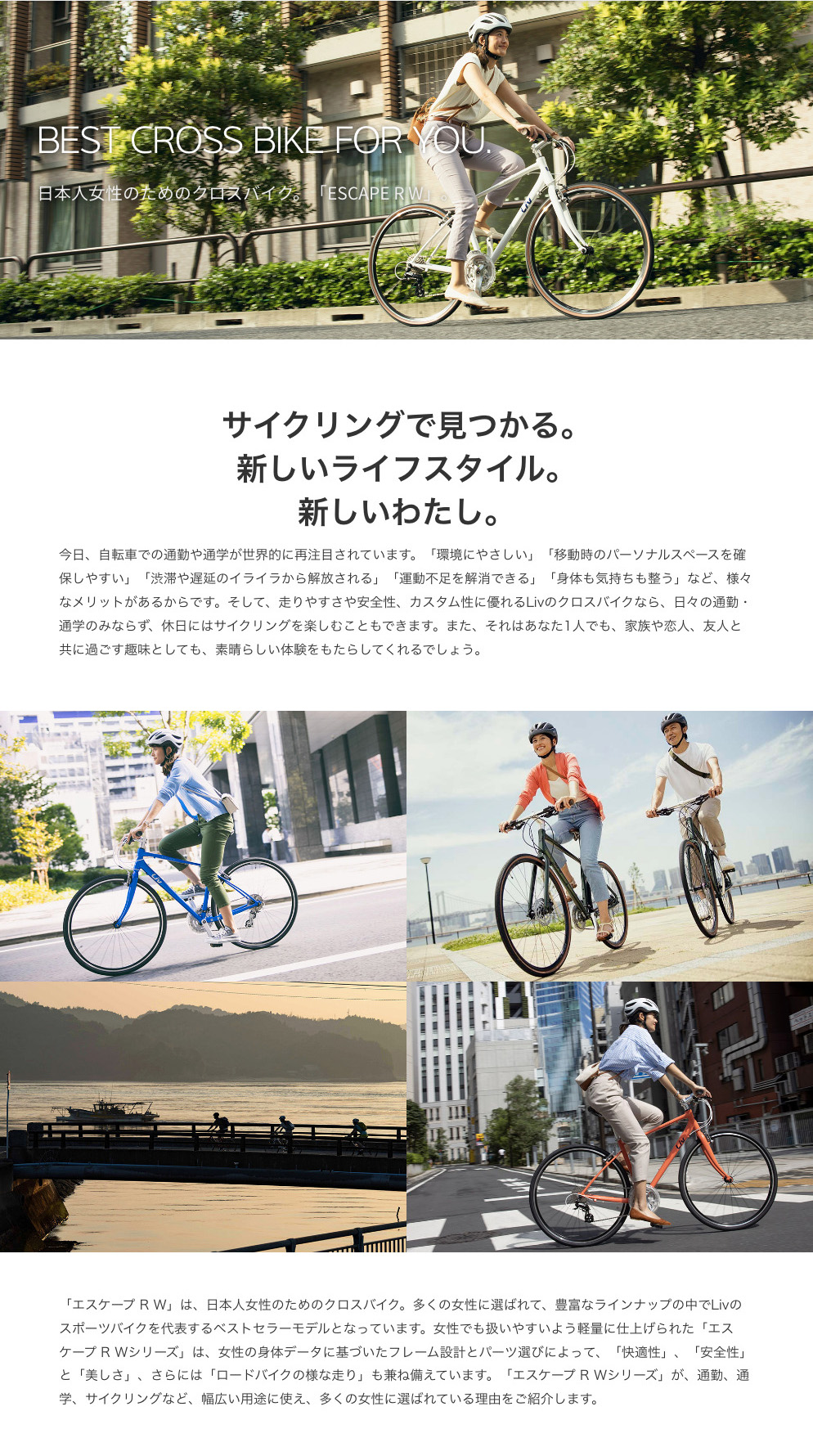 女性でも扱いやすいよう軽量に仕上げられた「エスケープ R Wシリーズ」は、女性の身体データに基づいたフレーム設計とパーツ選びによって、「快適性」、「安全性」と「美しさ」、さらには「ロードバイクの様な走り」も兼ね備えています。
