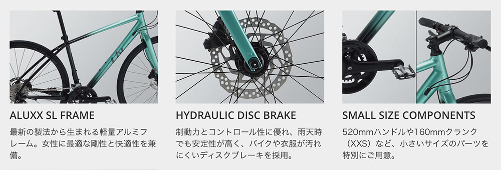 スポーティクロスバイクの女性専用モデル「エスケープRX W」シリーズは、ディスクブレーキ仕様の「ESCAPE RX W DISC」とリムブレーキ仕様の「ESCAPE RX W」のラインナップ。520mmハンドルや160mmクランクなど特別なスモールサイズパーツを採用するXXSサイズを展開。サドルも女性専用のコンフォートモデルにするなど、スポーツサイクルを始めたい女性を優しくサポートします。