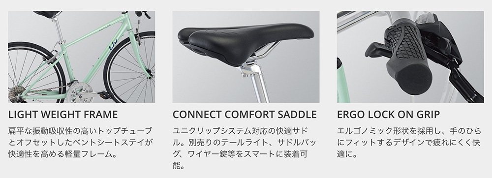 日本女性のライフスタイルにちょうどよい「エスケープR W」シリーズ。2022モデルは、フレームのカラー展開は2021モデル継続としながら、リアセンター長を5mm伸ばすなどのフレームジオメトリ変更で快適性を向上させました。30mmのやや幅広いタイヤ、握りやすいエルゴグリップ、優れたクッション性とユニクリップシステムの利便性を併せ持つサドルなど、女性専用設計ならではの快適仕様で、カジュアルなポタリングから本格的なスポーツサイクリングまで幅広く対応します。