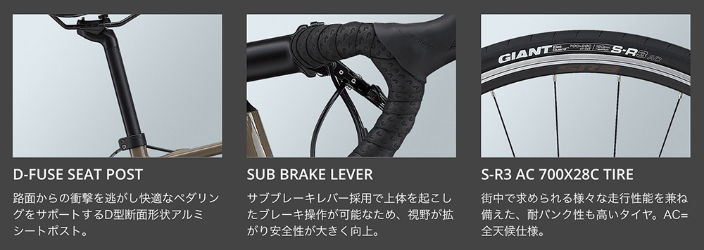 アルミフレームの「アヴェイル」は、はじめてのロードバイクに最適です。軽いギア比のドライブトレインによって、坂道も楽々。さらに、上体を起こした姿勢で使えるサブブレーキレバー、不快な振動を和らげるD-FUSEシートポストに女性用サドルを採用し、安心で快適なサイクリングを可能にします。身長145cm前後の小柄な女性にフィットするXXSサイズもラインナップしています。
