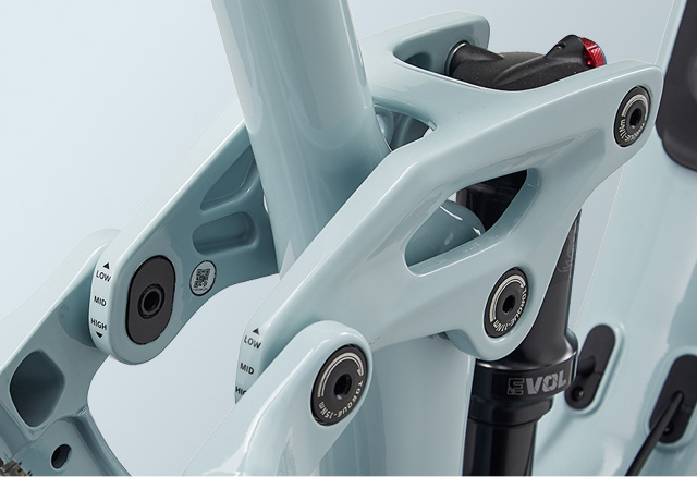 新開発の「フリップチップ マエストロ3」を搭載しており、ライダーはライディングスタイルや地形に応じてヘッドチューブ角、シートチューブ角、ボトムブラケットの高さをハイ、ミドル、ローの3段階に設定変更することが可能です。3つのポジションの平均的な変化は、ヘッドチューブとシートチューブの角度が0.4度ずつ、ボトムブラケットのドロップが5mmずつとなります。