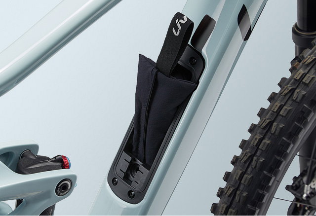 さらに、「INTRIGUE LT」はダウンチューブ内側にインテグレートストレージシステムを搭載しています。すっきりとした薄型のラッチ式開口部には、補給食やライドに必要なツールを収納できる耐水素材を使用したバッグが付属しています。