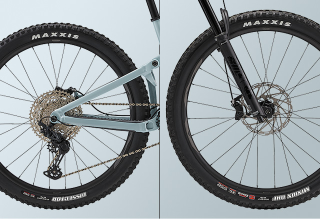 また、前29インチ、後27.5インチの前後異径ホイール専用設計によって、リアホイールトラベルが最適化されるとともに、外径の大きい29インチホイールは安定性と走破性の向上、27.5ホイールはより高い反応性を実現します。