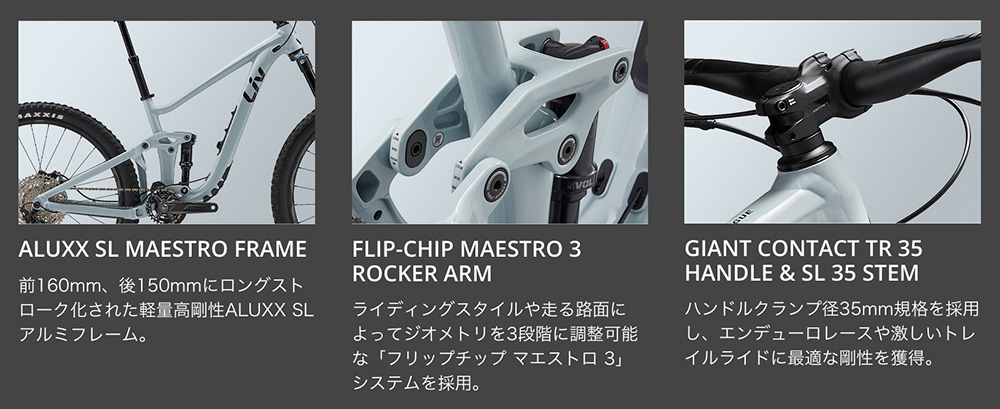 トレイルライドからエンデューロレースまでこなせる前160mm/後150mmストロークの女性用フルサスペンションMTB「イントリーグ LT」。安定性とコントロール性を高めるフレーム設計とともに、ライディングスタイルや走る路面によってヘッド角、シート角、BB高を3段階に調整できる最新リンクシステム「FLIP CHIP MAESTRO 3」を採用。高い汎用性によって、あらゆるコンディションでライダーに最適なパフォーマンスを提供します。