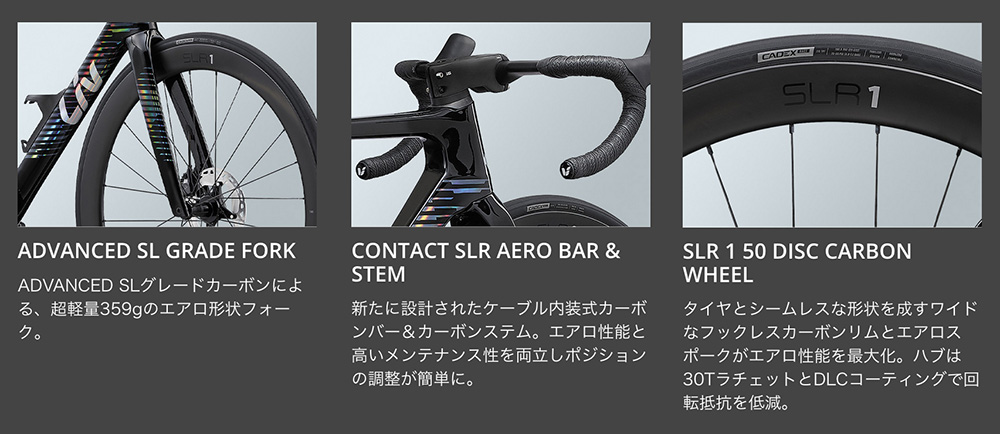 「SHIMANO ULTEGRA Di2」コンポーネントにパワーメーター、新設計のケーブル内装式カーボンバー&ステム、リム外幅30mmに拡張された「SLR 1 50 DISC」ホイールをスペック。