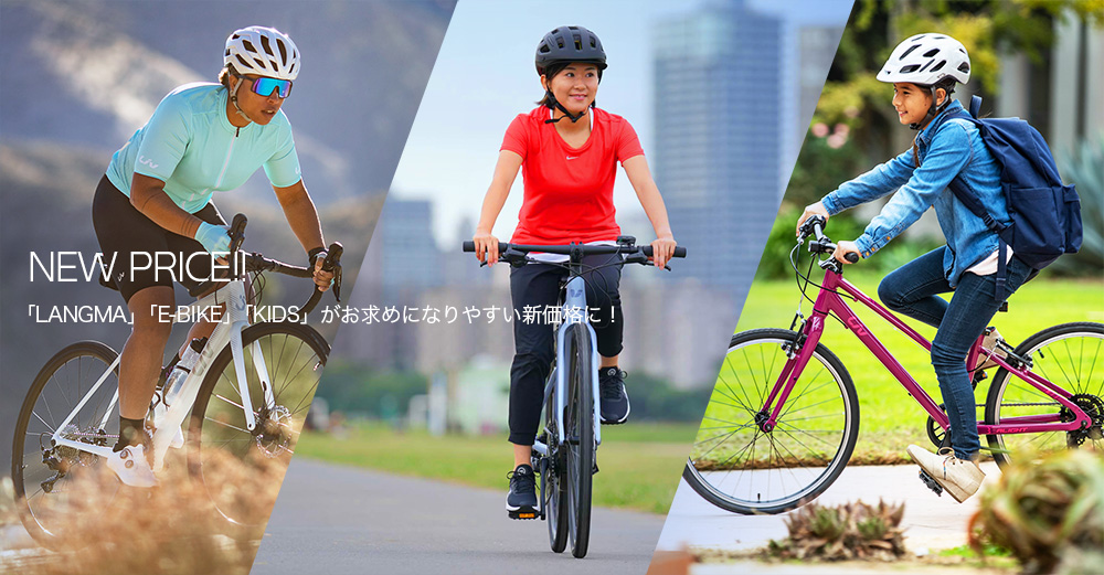 Livの2023モデルの一部を2024モデルとして継続し、よりお求めになりやすい価格に改定いたします。 対象モデルは、反応性・コントロール性の向上と軽量化を両立したオールラウンドなレースロードバイク「Liv LANGMA(ランマ)」シリーズ、そして、幅広い年齢層にスポーツバイクの楽しみを提供するEバイクおよびキッズバイクです。