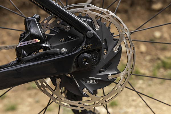 新たに追加されたFLIP CHIP DROPOUTにより、フレームのドロップアウトエンドの偏心ハードウェアの向きを入れ替えることで、ホイールベースとタイヤクリアランスの調整を可能にし、走る地形や路面状況に最適化することができます。ショートポジションは、加速性とクイックなハンドリングを特徴とし、最大45mmまでのタイヤに対応します。ロングポジションは、高速での安定性を向上させるとともに、最大53mmのワイドタイヤに対応するクリアランスを確保し、さらに高いトラクションを発揮します。