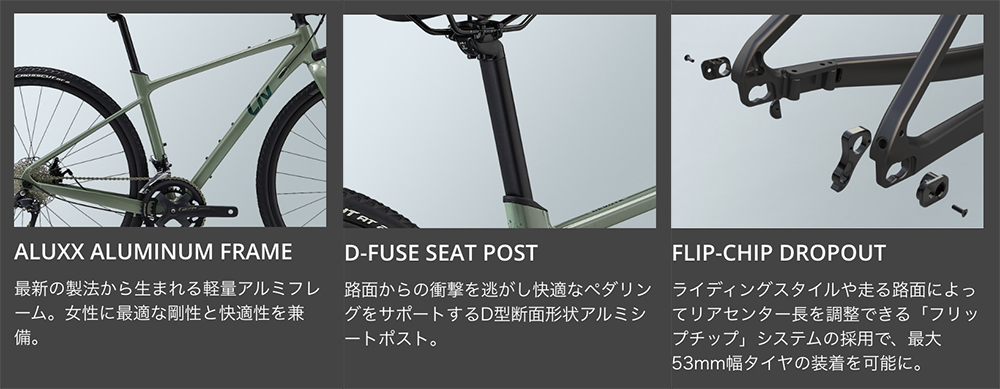 グラベルバイク「ディヴォート」がフルモデルチェンジ。女性用に設計された軽量アルミフレームにリアセンター長調節システム「FLIP CHIP」や豊富なアクセサリマウントを採用し、どんなグラベルにも対応できる汎用性を備えました。生まれ変わったディヴォートと共に、自然を感じるグラベルライドに出かけましょう。