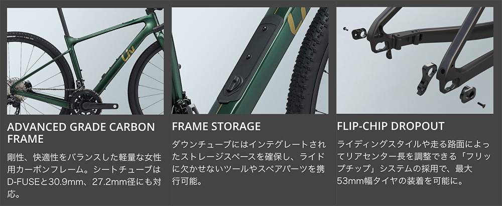 グラベルバイク「ディヴォート」がフルモデルチェンジ。女性用に設計された軽量フルカーボンフレームにリアセンター長調節システム「FLIP CHIP」やダウンチューブストレージを搭載し、これまでよりも高い汎用性を実現。PROグレードは、より軽量で高剛性なAdvanced SLフォークや電動コンポ「FORCE eTap AXS」、カーボンホイール「CXR 1」などを採用し、グラベルレースに特化したレーシングモデル。
