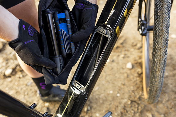 DEVOTE ADVANCEDシリーズには、新たにダウンチューブストレージが設けられています。これにより、ライダーはサドルバッグなどを使用しなくても、付属の防水素材でできたストレージバッグにインナーチューブ、CO2 カートリッジ、タイヤレバー、マルチツール、補給食などライドの必需品を入れて携行することができるようになりました。また、ストレージのカバーはウォーターボトルケージマウントとしても機能し、上下の向きを入れ替えることで、フレームやボトルのサイズに合わせて好みの位置に取り付けることができます。