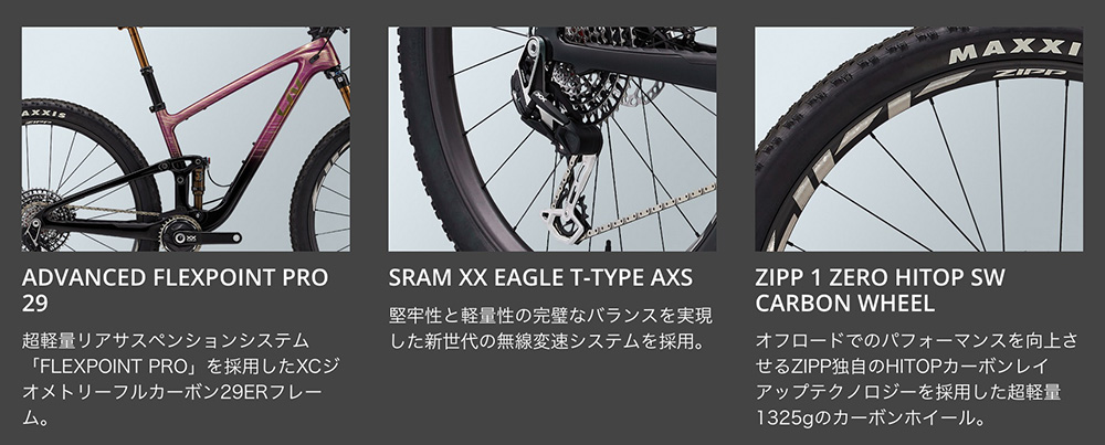 最新のXCレースシーンに合わせて、前120mm/後115mmトラベルへとアップデートされた「ピーク アドバンスド」。新たに超軽量サスペンションシステム「FLEXPOINT PRO」を採用し、前世代よりも297gの大幅な軽量化と10%のペダリング剛性を向上。フラッグシップのアドバンスド0には、FOX FACTORYユニットや最新のSRAM XX AXS T-typeをスペック。