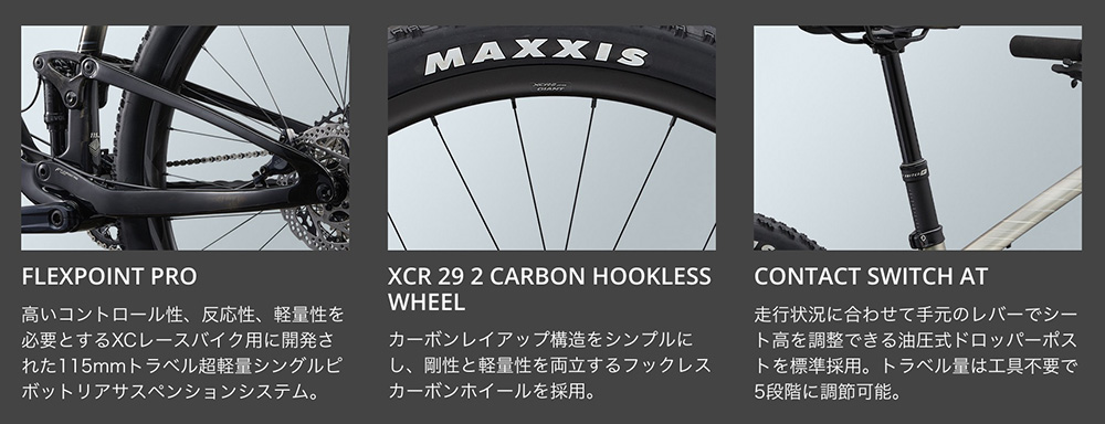 最新のXCレースシーンに合わせて、前120mm/後115mmトラベルへとアップデートされた「ピーク アドバンスド」。新たに超軽量サスペンションシステム「FLEXPOINT PRO」を採用し、前世代よりも297gの大幅な軽量化と10%のペダリング剛性を向上。軽量カーボンホイールやドロッパーポストなどをスペックしたレースレディパッケージ。