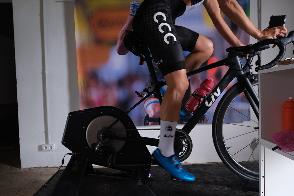 自宅でインドアトレーニングのためのスペースを確保できれば理想的です。可能であれば、トレーナー、前輪用ブロック、タオル、床を保護するマット、扇風機、そしてモニターなどの必要機材のすべてをそのスペースに設置しましょう。そうすれば、あなたがトレーニングしたいときに、バイクをセットするだけで簡単にライドをスタートできます。Zwiftのようなオンラインアプリを使用したい場合は、電源の位置と、PCやタブレットなどのデバイスやモニター、それらを置くテーブルなどについても、準備しておきましょう!