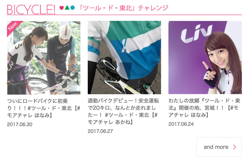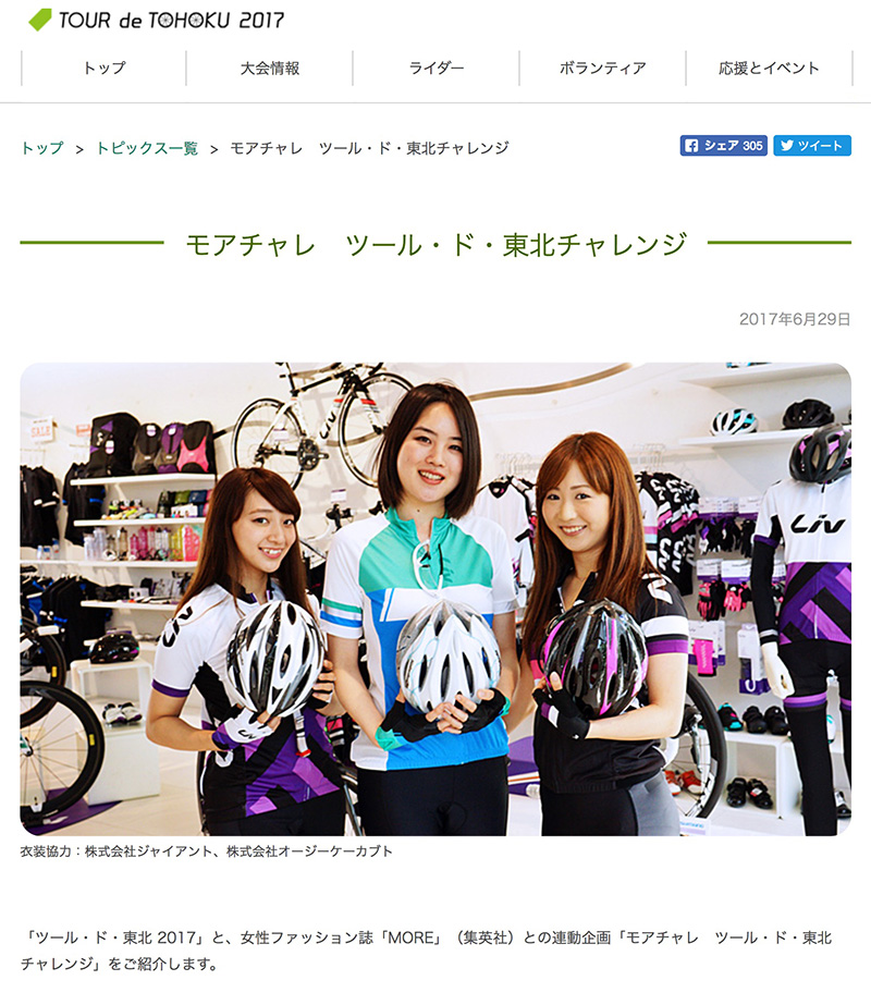 今年は人気の女性誌「MORE」の読者モデル3名が「モアチャレ ツール・ド・東北チャレンジ」として65kmのサイクリングに挑戦します。