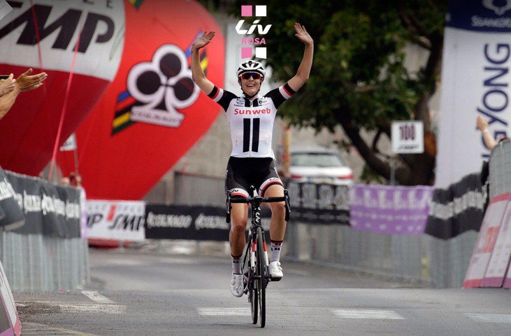レース前半から単独で逃げていたテティヤナ・リアブチェンコ(ウクライナ)に、チーマコッピで単独追走にでたブランドが30kmかけて追いつき、そのまま単独アタック。Livの新型ロード「LANGMA ADVANCED SL」に乗ったブランドは、テクニカルな下りで剛性に優れるバイクの性能を生かし、リアブチェンコを突き放すことに成功しました。
