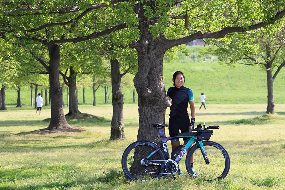 安曇さんは、登山好きの両親と一緒に山を縦走するなどアクティブな子供時代を過ごし、高校までは陸上部で400mトラックを専門に活動。身近な人がトライアスロンをやっていたこともあり「もっと伸び伸びと、そしてもっと自由に走ってみたい!」と、大学進学を期にトライアスロンに挑戦。現在は、小学校教員として働きながら、ロングディスタンスのレースを中心に活動しています。