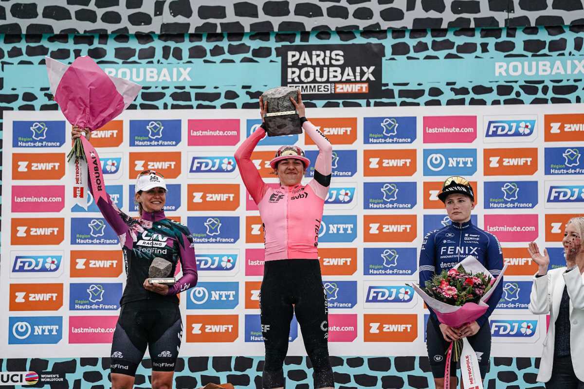 Liv Racing TeqFindのカティア・ラグーザ選手が、開催3回目を迎える女子レース「パリ〜ルーベ ファム」で2位に入り、表彰台に立ちました。