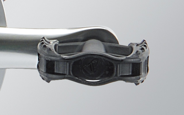パンプスなどで乗っても滑りにくく靴底を痛めにくい、新設計の軽量プラスチックペダル。
