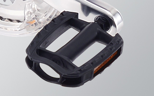 パンプスなどで乗っても滑りにくく靴底を痛めにくい、新設計の軽量プラスチックペダル。