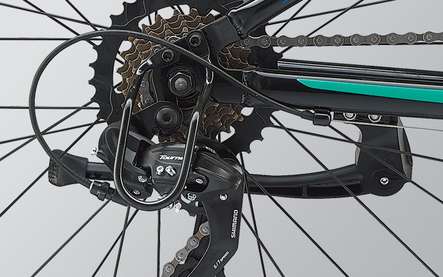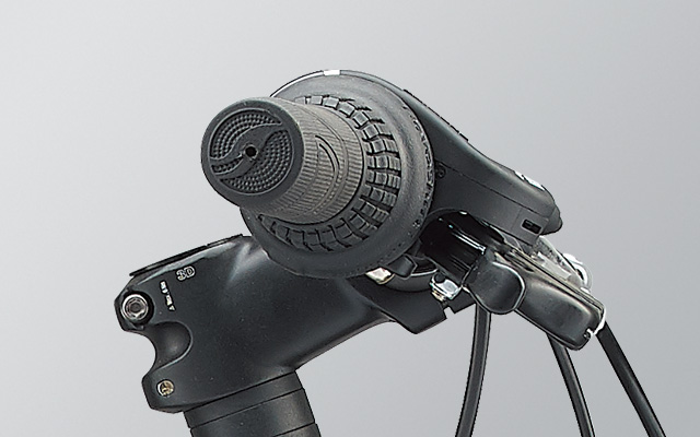手指の小さいジュニアでも問題無く、直感的にギアシフトができるシマノ製グリップ式シフター。