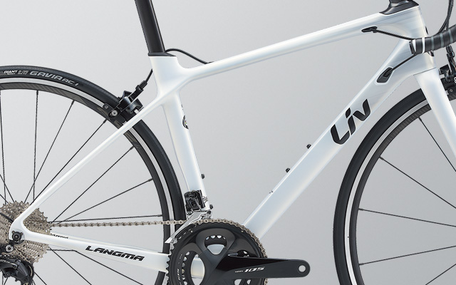 女性の脚力に合わせてカーボンレイアップで剛性バランスを最適化した、超軽量カーボンフレーム。