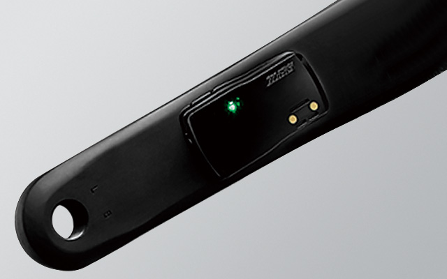 左側のクランクアームでペダリング時のパワーを計測する独自開発のパワーメーターを標準採用。
