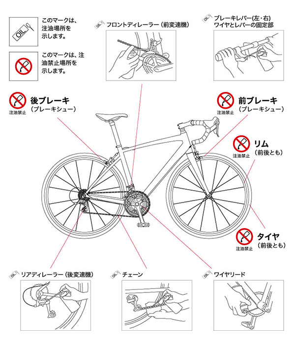 車体の汚れを落とし、変速機等の必要箇所にオイルとグリスを適切に塗布します。