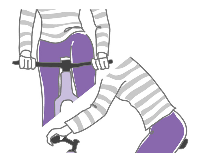 サドルにしっかりと座り背中を自然に丸める。 大きなボールを抱えているようなイメージで。