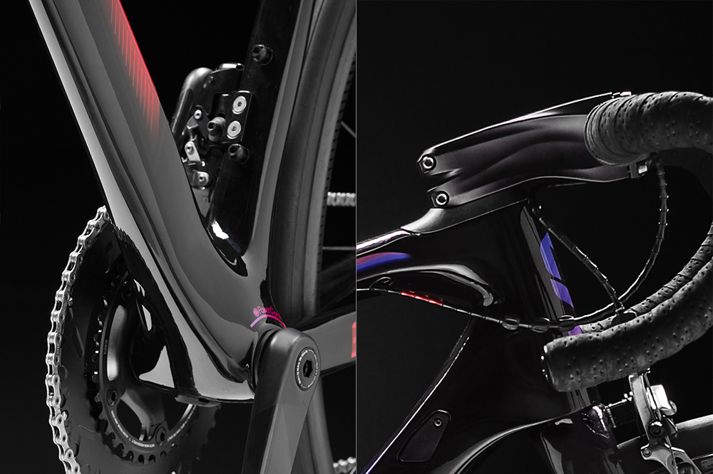 ランマは、レディースプロロードチームからのフィードバックに基づき、剛性までも女性に最適化。GIANTの高剛性テクノロジーである「オーバードライブ2(=大径コラム)」や「パワーコア(=大容積BBシェル)」などを採用しながら、フレーム形状やカーボン積層を女性の脚力特性に合わせた専用設計とすることで、最終的にはGIANT TCR対比で約11%低い剛性値に最適化されています。