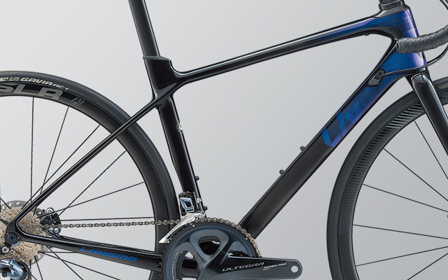 美しいフォルムのカーボンフレームは、軽量さとしなやかさだけでなく、風を受け流すエアロ性能も期して設計されています。
