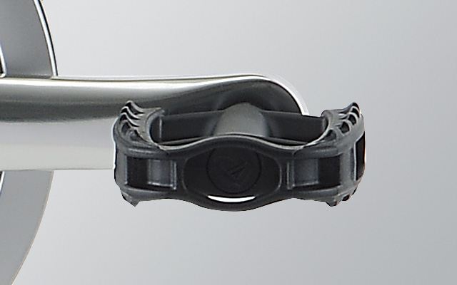 パンプスなどで乗っても滑りにくく靴底を痛めにくい、新設計の軽量プラスチックペダル。