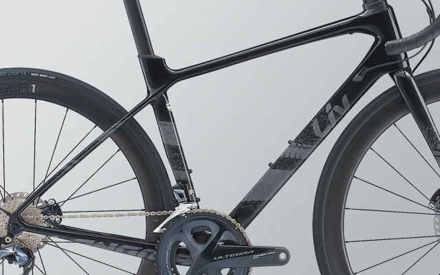 女性の脚力に合わせてカーボンレイアップで剛性バランスを最適化した、超軽量カーボンフレーム。