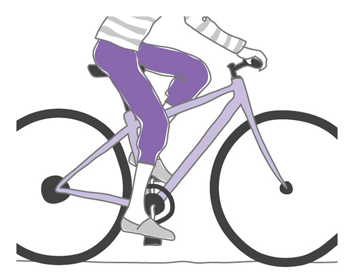 サドルの高さサドル高は、腰骨(腸骨稜のトップ)の位置を目安にします。サドルにまたがり一番下にしたペダルに足をのせ、膝が軽く曲がり、逆の脚のつま先が地面に着く程度が適切なサドル高となります。