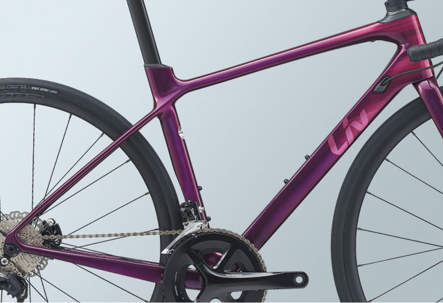 女性の脚力に合わせてカーボンレイアップで剛性バランスを最適化した、超軽量カーボンフレーム。
