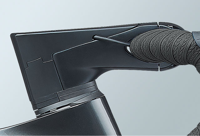 専用のケーブル内装式カーボンバーとアルミステム。エアロ性能と剛性を高次元で両立させる。