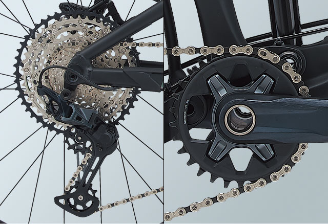 ワイドレシオで軽量性とシンプルな操作性に優れるシマノSLX12速ドライブトレインを採用。