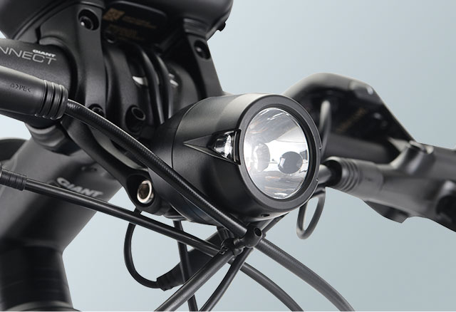 本体バッテリーから給電式の高性能LEDフロントライト。コンパクトなボディーながら光度1500カンデラの安定した明るさを実現。