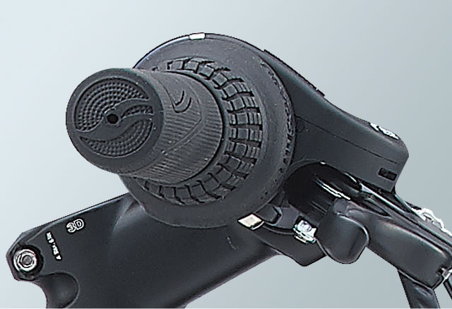 手指の小さいジュニアでも問題無く、直感的にギアシフトができるシマノ製グリップ式シフター。