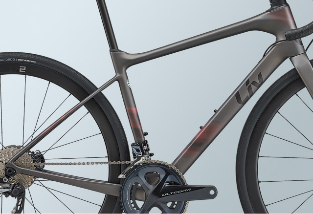 長距離のライド用に最適化されたカーボンフレームは、軽量で快適性を高めた女性専用設計。