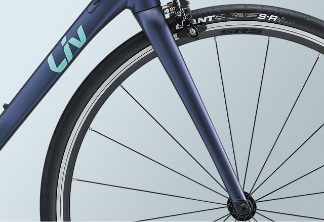 下側1-1/4のテーパーコラムを採用するフルカーボンフォークによりステアリング剛性と軽量性を両立。