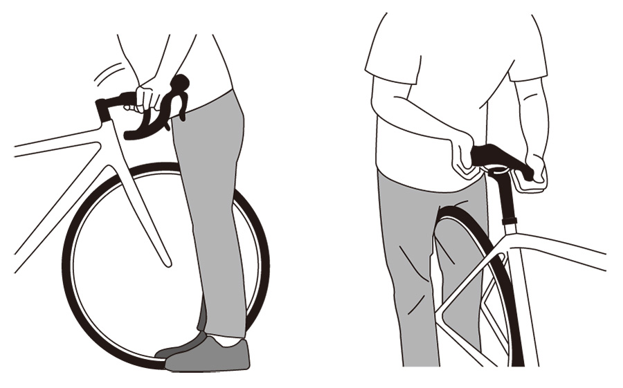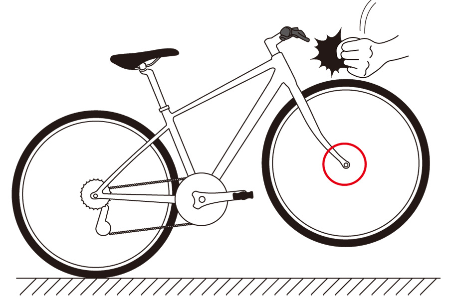 前・後輪を10cm程持ち上げて上から叩き、クイックレリーズ/スキュワーナットに緩みがないか、確認します。
