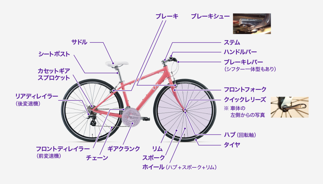 ブレーキシュー(上部バイク写真右上:リムに当たるゴムの部分)の残量を目視し、ゴムの溝が深さ1mm以下になっていたらシューの交換時期です。