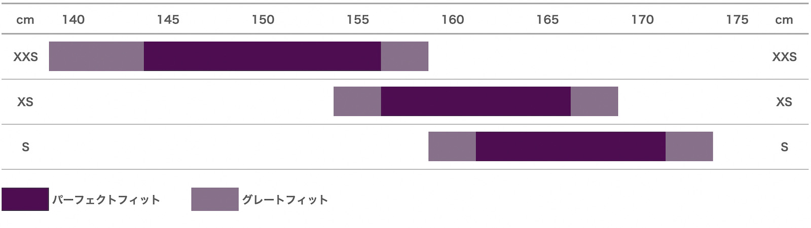 以下のチャートでは、ジャンル毎の身長に対する適応サイズをご確認いただけます。チャートはあくまでも参考値であり、適合を完全に保証するものではありません。サイズの選定については、正規販売店にてご相談ください。