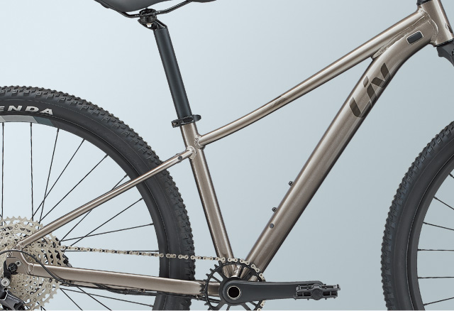 里山ライド初心者女性の安心感を高める、足つき性の良さを生み出すシートチューブ長を採用した女性用フレーム。