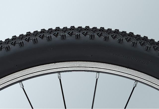 軽い走りとグリップを両立するセミブロックタイヤは安定性の高い2.1インチ幅。