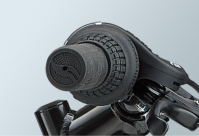 手指の小さいジュニアでも直感的に変速できるシマノ製グリップ式シフター。